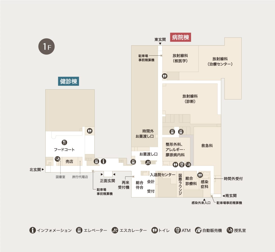 | 1F | フードコート、売店、旅行代理店、図書室 | 1F | 総合受付、入退院センター、薬局、国際ラウンジ、外来診察室(総合診療科、放射線科、整形外科、アレルギー・膠原病内科、救急科、感染症科) |