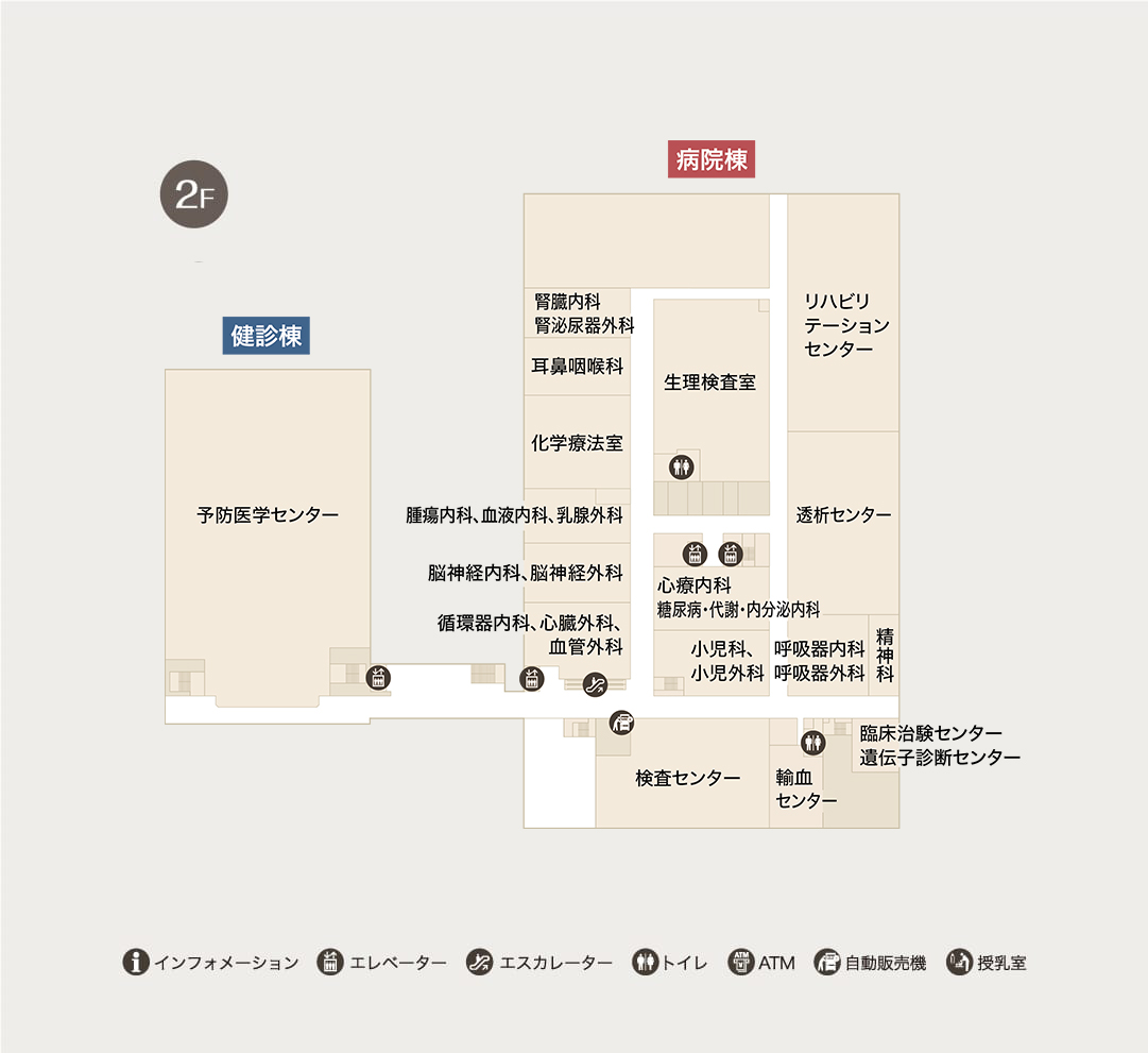 | 2F | 予防医学センター | 2F | リハビリテーション室、検査センター、生理検査センター、透析センター、外来診察室(小児科、小児外科、呼吸器内科、呼吸器外科、循環器内科、心臓外科、血管外科、ペインクリニック外来、脳神経内科、脳神経外科、腫瘍内科、血液内科、乳腺外科、化学療法室、耳鼻咽喉科・頭頸部外科、腎臓内科、腎泌尿器外科、糖尿病・代謝・内分泌内科、精神科) |