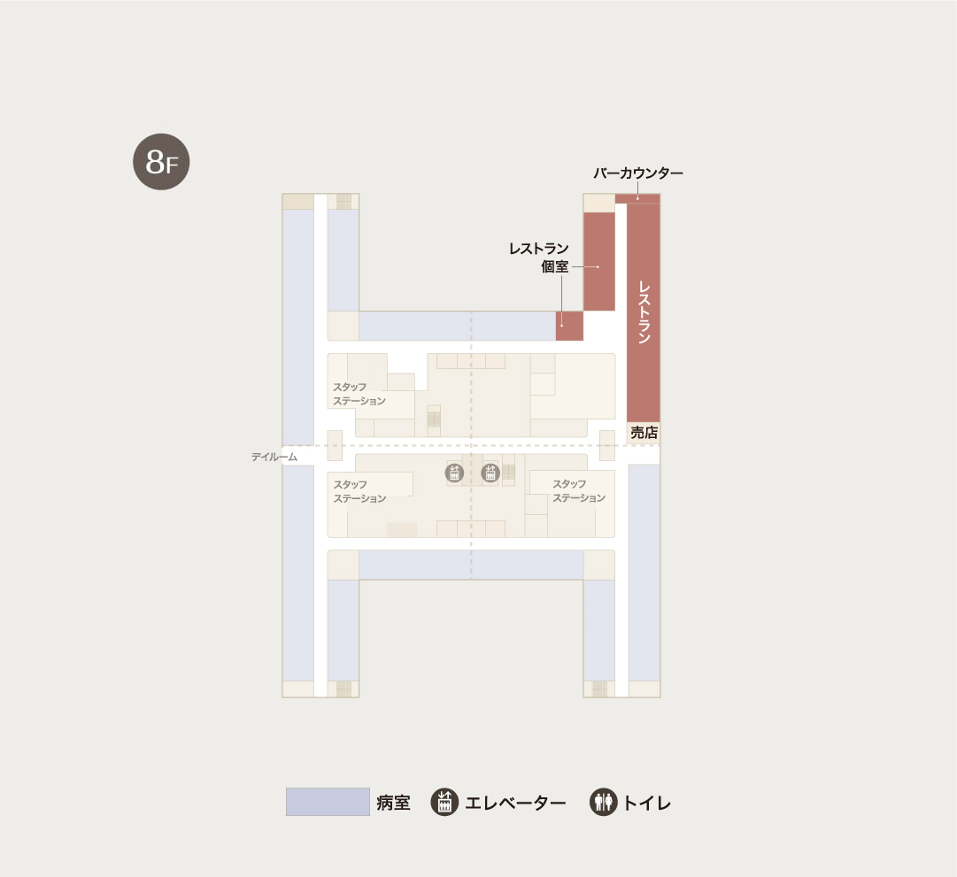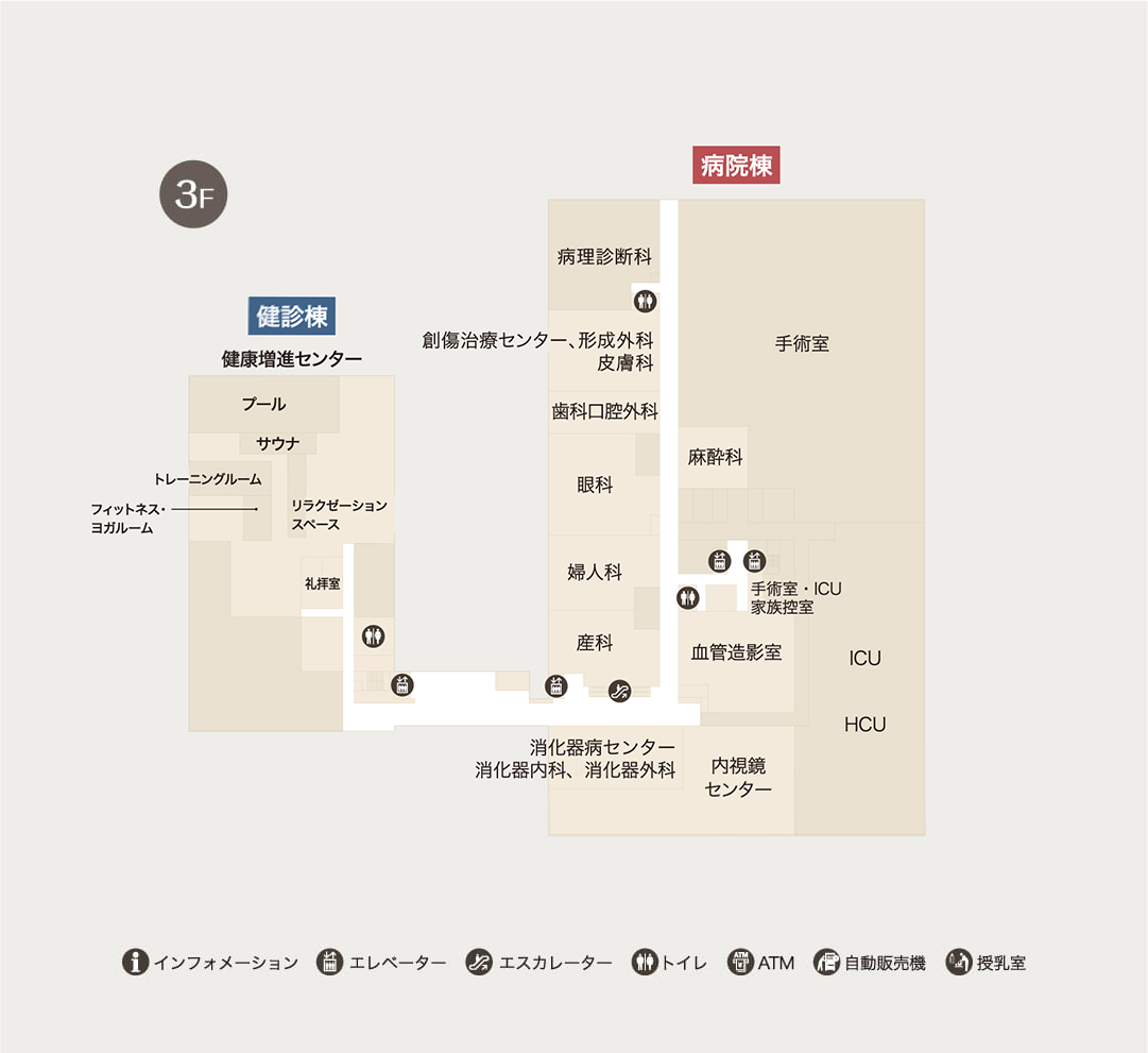 | 3F | 健康増進センター(プール・ジム・サウナ・フィットネスジム、リラクゼーションスペース)、礼拝室 | 3F | 手術室、ICU、HCU、外来診察室(消化器内科、消化器外科、内視鏡センター、産科・婦人科、眼科、歯科口腔外科、形成外科、皮膚科、血管造影室、麻酔・集中治療科)、病理診断科 |