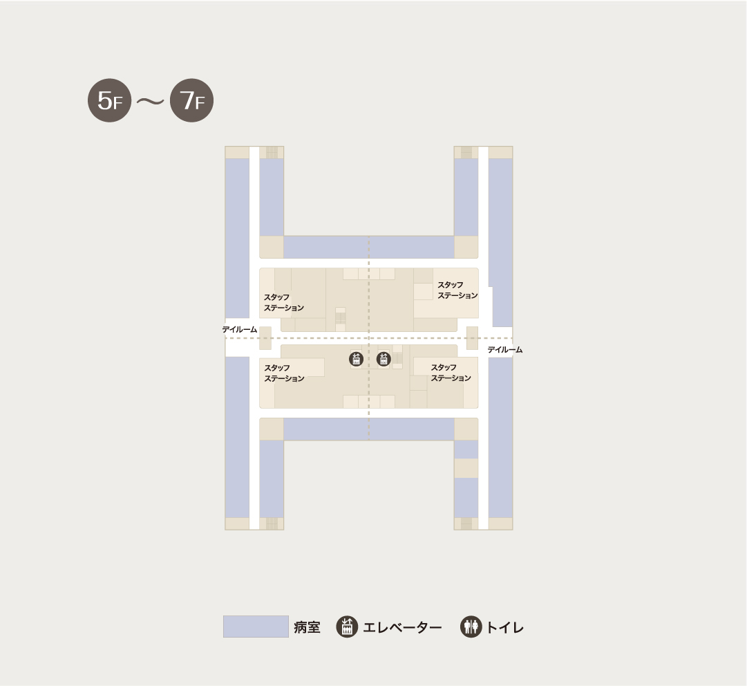 | 3F | 手術室、ICU、HCU、外来診察室(消化器内科、消化器外科、内視鏡センター、産科・婦人科、眼科、歯科口腔外科、形成外科、皮膚科、血管造影室、麻酔・集中治療科) |