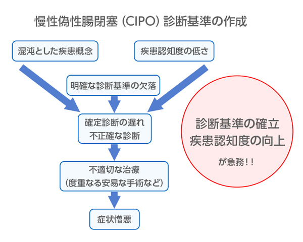 慢性偽性腸閉塞症(Chronic Intestinal Pseudo-Obstruction:以下CIPO)は、器質的疾患が存在しないのにもかかわらず長年にわたり腸閉塞症状を来す難治性疾患であり、時に致命的となりうるなど、非常に重篤な病気です。しかし、疾患認知度の低さや疾患概念が未だ整理されていないことなどから確定診断までに平均7年以上かかるとも言われ、その間適切な治療が行われずに長期間経過観察されている患者様も多いと考えられています。また、我が国でも年間発症数は1240人程度と試算されており1)、稀少な疾患のためにその病態解明や治療法の確立がほとんどなされていないのが現状です。この悲惨な現状を打開すべく、我々は初めて正式な診断基準を作成し、さらにこの診断基準の感度は86.3%と臨床上非常に有用なものであることを報告しました2)。