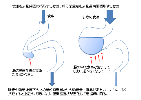 CIPOは食事を腸の中で運ぶ速度がゆっくりになる病気で、運べる速度、量以上に食事や成分栄養剤を摂取すると腸の中にたまりができて食事が詰まってしまい腸閉塞症状が悪化します(下のイラスト参照)。したがって、できるだけ少量を、特にガスになりにくい食事をとることが肝心です。成分栄養としてエレンタールなどを内服している場合も同様に、できるだけ少量を小分けにして長時間かけて服用することです。