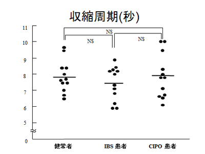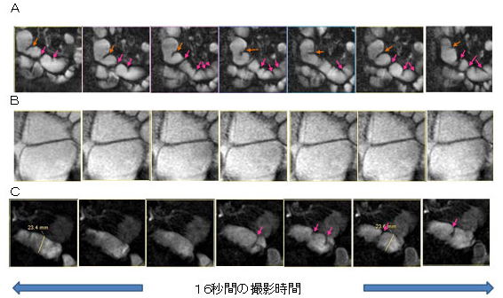 通常大腸は20分に1回程度の蠕動だけですが、一方小腸は10-20秒毎に蠕動して内容物を絶えず輸送しています。Aは健常人の小腸の一部で小腸の拡張を認めず、さらに16秒間の撮影期間中に活発な腸管の収縮拡張運動を認めます。一方BはCIPOの患者様の画像ですが、16秒の間に腸管の運動は全くなく、また内容物が停滞するためAと比べて腸管径も著明に拡張しています。なおCもやはりCIPO患者様の小腸ですが、拡張ははっきりとは認めないものの運動は正常例を比較すると非常に緩慢なのが分かります。我々はこれまでシネMRIを用いてCIPOの患者様の小腸と健常者の小腸の動きを比較し、CIPOの小腸の動きが非常に低下している事を明らかにしました。シネMRIは簡便なうえにほぼ全小腸の運動を観察でき、腸ろうの造設の際や、治療前後での比較など今後活用が期待されます。
