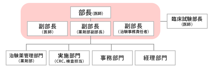 治験管理部は、院内で治験や製造販売後調査等が安全かつ関連法規に則り、円滑に実施されるように支援する組織です。