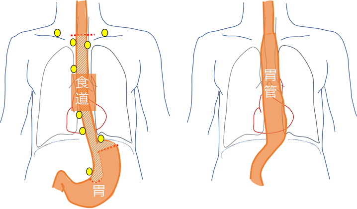 食道がんは食道粘膜にできる悪性腫瘍です。他の消化器がんと比較して、リンパ節などに転移をきたしやすいという特徴があります。初期は無症状ですが、進行するとつかえ感や胸部違和感、体重減少などの症状が現れます。日本では喫煙とアルコールが危険因子となっている扁平上皮癌と呼ばれるタイプのがんが多いです。最近は生活スタイルの欧米化を反映してか、腺癌とよばれるタイプのがんも増加傾向です。