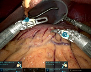 切除可能な胃がんに対しては、手術が治療の中心となります。胃の下3分の2を切除する幽門側胃切除術、胃の上の方を切除する噴門側胃切除術、胃全体を切除する胃全摘術など病変の大きさ、部位、臨床的ステージによってさまざまな術式があります。当院の特色としては、傷が小さく手術によるダメージが少ないロボット支援下胃切除や腹腔鏡下胃切除術を積極的に行っています。特にロボット支援手術では、ハイビジョン3D画像による手術部位の立体視機能やロボット鉗子の手振れ防止機構が付加され、腹腔鏡手術のメリットがさらに進化したため、良好な術後成績が得られています。術後早期の退院が可能となり、当科における標準的な入院期間は8日~14日となっています。