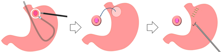 後者の方法では、消化器内科の専門医が胃カメラを用いて胃の内側から腫瘍近傍を切開し、それと同時に外科医が腹腔鏡下に胃の外側から腫瘍を挟み撃ちにしてくり抜くことにより、腫瘍を過不足なく安全に摘出することが可能です。この方法は外科と内科が協力して行う画期的な術式で、胃機能を温存可能な低侵襲手術として注目されています。