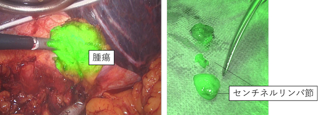 インドシアニングリーン(ICG)と呼ばれる色素を用いて術中に胃がんのリンパ流を観察するナビゲーション手術をとりいれています。ICGの蛍光特性を用いて腹腔鏡下で蛍光観察を行うことで、手術中に腫瘍の位置やリンパ流をリアルタイムに確認することができます。