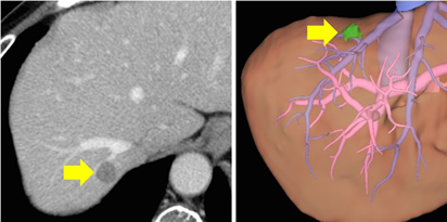 左上図は転移性肝臓がんの手術前のCTですが、腫瘍(黄色矢印)は血管に近いものの肝臓表面近くに位置しており、比較的容易に手術が可能と考えられます。3D構築像(右上図)でみても肝臓表面の小さな腫瘍であることがわかります。実際の手術では、腫瘍を含めた部分切除という術式が選択されました。