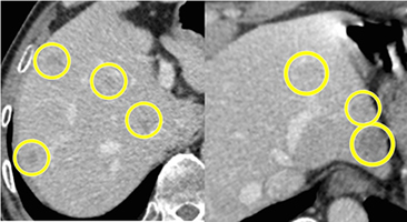 上図も転移性肝臓がんの手術前のCTですが、黄色の丸で囲ってある部位に腫瘍が存在します。この症例では肝臓の左右に腫瘍が多発していました。