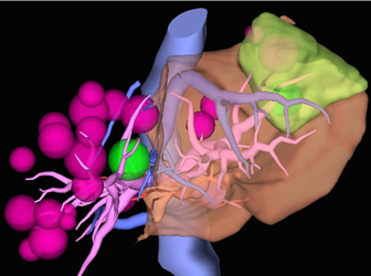 このCT画像をもとに3D構成をした画像が上図となります。腫瘍(ピンクや緑の球体で表示)は肝臓の右側(図では左側)に多く位置しておりますが、肝臓の左側(図では右側)や肝臓の深部にも腫瘍が存在していることがおわかりになると思います。このような症例では、施設によっては手術が困難とされることもあるかもしれませんが、手術の方法を工夫することで十分に取りきることが可能と我々は考えます。