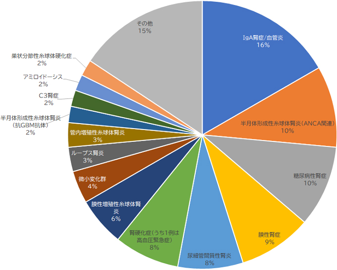 原発性糸球体腎炎 / 糖尿病・高血圧・膠原病などによる二次性腎疾患 / 多発性嚢胞腎を含めた遺伝性腎疾患 / 急性腎障害、間質性腎炎などの腎疾患ならびに急性・慢性腎不全の透析療法やその合併症 など