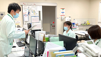| 9:30 | 外来/入院栄養相談、病棟患者様の栄養管理業務 週1回午前中に外来栄養相談を担当しています。担当日以外は、午前中退院される入院患者様の栄養相談や、食欲不振等で個別対応が必要な患者様を訪問し、食事の対応をおこなっています。 困ったときには経験豊富な先輩に相談しています。 |