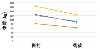 当院では2022年1月に第一例目の手術を行い、2023年8月の時点では4例(男性2名、女性2名、平均年齢56歳)の手術を行っています。全例で合併症もなく無事手術を終えています。術後、平均30.5㎏の減量が達成できており(図1)、この成績は全国で減量・代謝改善手術を受けられた2,885症例(65歳未満)の平均27㎏の減量(文献1)と比較しても遜色ありません。また、4人中3人に糖尿病があり、術前は薬物治療(1名はインスリン治療を含む)がされていましたが、術後は全例薬物治療なしで、HbA1c 6.5% 未満を達成できています。このことは、いわゆる「糖尿病が治った」とされる「寛解(かんかい)」基準を満たしています(文献2)。