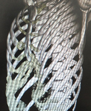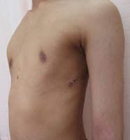 手術としては、Nuss(ナス)手術という低侵襲な手法がひろく行われており、当院でもその方法を採用しています。左右の腋窩に3cm程度の切開を加え、そこから細長い金属のバーを挿入して胸骨の裏に沿って留置するという方法です。バーは2~3年間留置したのちに抜去します。また、術後の疼痛に対しても硬膜外麻酔チューブや患者管理鎮痛法(PCA)など麻酔科と議論しながら積極的に疼痛管理を行っております。また、年少児の漏斗胸に対しては、バーの挿入をせずに変形した肋軟骨を切除するラビッチ法を取り入れています。