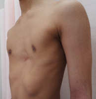 胸骨下部を中心とした胸部の陥凹を示す疾患です。原因は不明とされていますが、肋軟骨という部分が過剰に成長してしまうことで起こるとも言われています。胸郭の変形は自然に改善することは少なく、年齢とともに変形が進んでしまうこともあります。心臓や肺の圧迫の影響で胸痛や労作後の呼吸器症状などを呈することもあります。また整容面を気にして内向的になるとの報告もあります。以上の事項を総合的に考慮して、十分に説明をした上で治療を選択いたします。