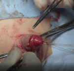 停留精巣は生まれつき精巣が鼠径部(太腿の付け根)や腹腔内に位置する異常です。乳児検診などで見つかることが多い疾患ですが、陰嚢内に固定する手術をしないと将来的に男性不妊の原因となります。当科では、高位型の停留精巣に対しては積極的に腹腔鏡補助下手術を採用し、陰嚢底部に緊張なく固定する方針としています。