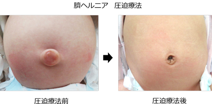 当科では、ヘソに小ガーゼ球を挿入して絆創膏で固定を行う圧迫療法を推奨しています。これにより、自然経過よりも短期間に、95%以上の治癒率を期待でき、皮膚の緩みも少なくすることができ、良好な成績をおさめています。