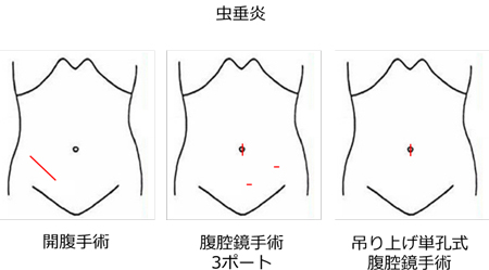 抗生剤の内服や点滴での治療で終わることもありますが、最終的には手術が必要になることが多く、症状によっては緊急手術を必要とすることもあります。当科では腹腔鏡手術を積極的に取り入れており、症例によってはヘソの創のみで手術を行う単孔式腹腔鏡手術も行っています。さらに、腹腔内にガスの注入(気腹)をせずにヘソの創部から虫垂を引き出して虫垂切除を行う『吊り上げ単孔式腹腔鏡手術』という、最も負担の少ない手術も積極的に行っています。