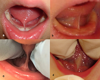 舌小帯は舌の裏側と口腔底にくっついた胎児期の遺残膜で、舌小帯短縮症では、その膜(舌小帯)が遺残したために舌の動きが制限されるため、新生児期/乳児期には哺乳に関するトラブル(浅飲み、母乳育児のみの場合に体重増加不良、乳頭痛、繰り返す乳腺炎など)、幼児期以降には、サ行、タ行、ラ行などがうまく発音できない(構音障害)やリコーダーなどの吹奏楽器がうまく吹けないなど、の症状をきたします。ひどい場合は、咀嚼・嚥下障害の症状が出現することもあります。