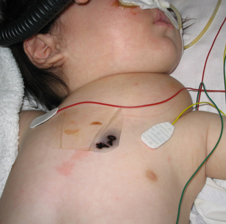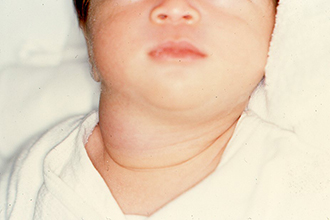 胎児超音波検査で頚部リンパ管腫を指摘されていた症例で、生後4か月時に病変が急速に増大して、呼吸困難で受診、外来で緊急気管挿管・緊急入院となりましたが、透視下に硬化療法を行ったところ、嚢胞性病変のほとんどが潰れて、治療後は腫れなくなり、元気に過ごしています。