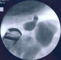 病変内に注入し、透視で病変への広がりを