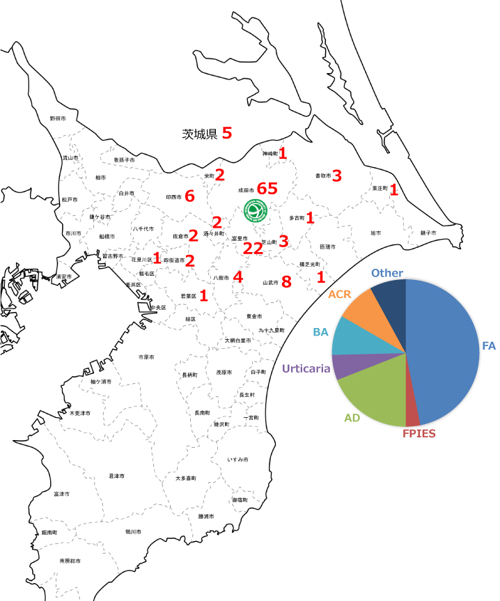 疾患内訳:約半数が食物アレルギー、アトピー性皮膚炎などの皮膚アレルギーが約25%、気道アレルギーが約2割