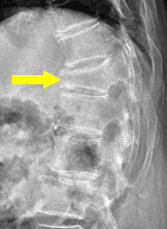 せぼね(脊椎)は7個の頚椎、12個の胸椎、5個の腰椎と仙椎から構成されます。腰椎は主に5つの骨と、間にあるクッションのような椎間板、また神経組織が通っている脊柱管から成り立っています。骨粗鬆症性椎体骨折は、骨脆弱性のため脊椎が骨折してしまう病気で、骨粗鬆症のある高齢女性に多く見られます。尻もちなど軽微な転倒で発生することが多いですが、くしゃみ程度でも生じることがあり、約半数ははっきりとした原因が不明なためいつの間にか骨折とも言われています。