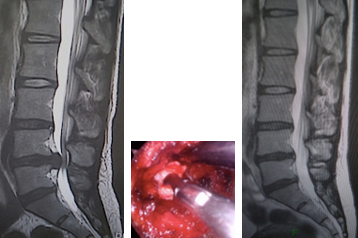 (左)術前MRI 第4/5腰椎に椎間板ヘルニアを認めます。(中)内視鏡下(MED)にヘルニアを摘出しました。(右)術後MRI 第4/5腰椎の椎間板ヘルニアが消失しています。