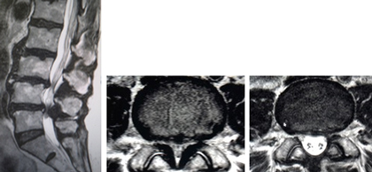 (左、中)術前のMRIでは特に第4/5椎間で脊柱管の高度な狭窄を認めています。(右)棘突起縦割式椎弓形成(切除)術を施行し、脊柱管は著明に拡大し神経症状の改善を認めています。