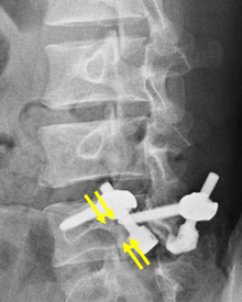 側方経路腰椎椎体間固定術(LLIF) 椎間板に大きなスペーサーが挿入され、また経皮的に椎弓根スクリューの挿入とロッドの連結がなされ、第4腰椎のすべりが矯正され固定されています。