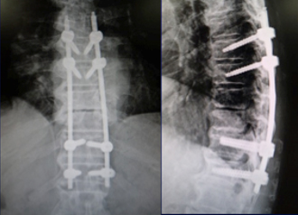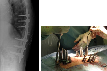 腰の第4番目、5 番目の椎体が感染し、進行性の骨破壊と後弯変形を認めます。経皮的椎弓根スクリューを用いた特殊な方法で、脊椎を安定化しています。