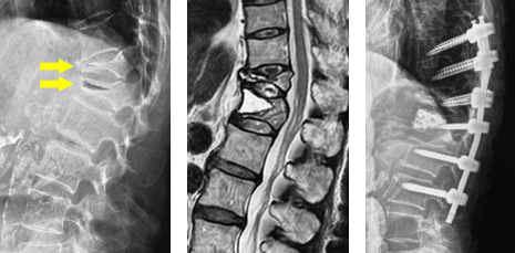 (左)第12胸椎および第1腰椎の骨粗鬆症性椎体骨折を認めます。(中)MRIでは第1腰椎に大きな骨欠損を認め、骨折が難治性で不安定であることを示しています。(右)第1腰椎に椎体形成術を施行し、さらに骨が脆かったため、頭尾側にスクリューを挿入して固定しています。