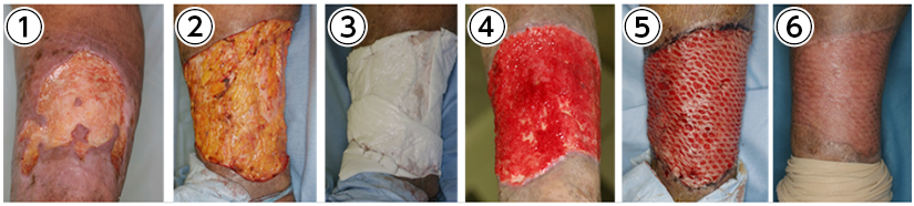 ④壊死組織切除部に良好な血流の組織が形成されたので⑤網状植皮を行いました。