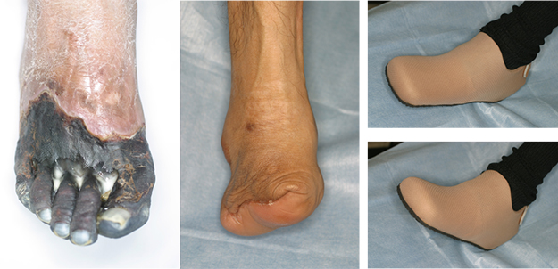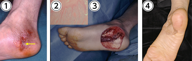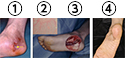 ④左第1、3趾は切断、アキレス腱部は外用薬、踵は植皮で治療しました。
