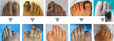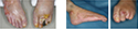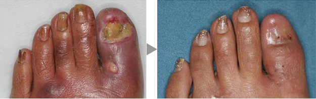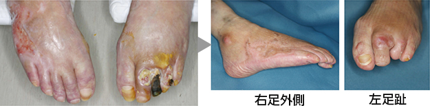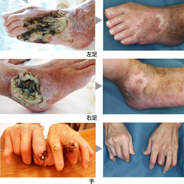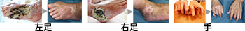 両足ともに壊死組織を切除して、局所陰圧閉鎖療法後に網状植皮を行い治癒しました。また、この方は手指にも潰瘍がありましたが、軟膏治療で治癒しました。