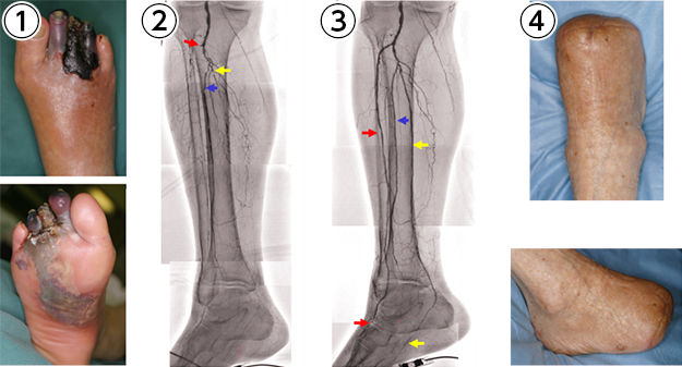 ②血管造影写真で、膝下の3本の動脈に閉塞が確認された(赤・青・黄矢印の先端部)ので循環器内科でカテーテル治療を行いました。