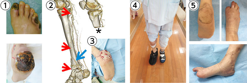 ①虚血を合併した糖尿病性右足壊疽を生じた患者様は、左下腿をすでに他院で切断されていました(②の*)。