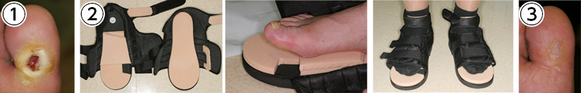 ①右第1趾潰瘍 ②使用した免荷サンダル ③治癒しました
