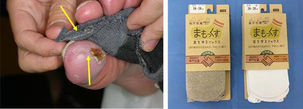 靴下の縫い目による些細な圧迫や擦れ(黄矢印)も、足に障害のある方にとっては大敵です。 爪、たこ、魚の目のケアはもちろん、靴下選びもおろそかにできません。つま先に縫い目がない靴下等も市販されています。