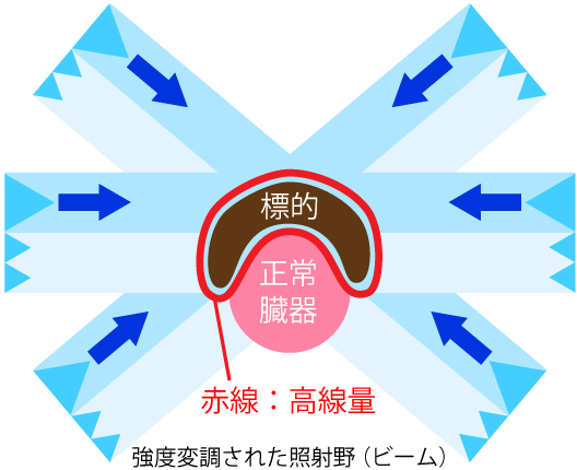 強度変調放射線治療(IMRT: Intensity-modulated radiation therapy)は、不均一な強度の放射線を多方向から照射することにより、腫瘍の線量を確保しつつ周囲の正常臓器の線量を低減することができる最新の照射技術です。当院では、IMRTの応用型で回転原体照射に強度変調機能を加えた照射法である強度変調回転放射線治療(VMAT: Volumetric-modulated arc therapy)を用いています。