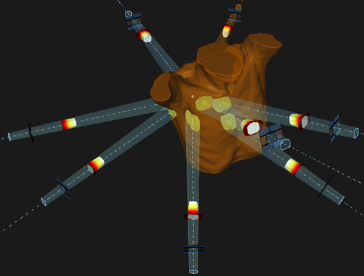 多方向からビームを照射して放射線量を腫瘍に集中させるがんに正確に照準をあわせる画像誘導放射線治療(IGRT)