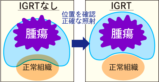 画像誘導放射線治療(IGRT: Image-guided radiotherapy)は、治療直前や治療中に取得したエックス線透視画像やCT画像をもとに、日々の位置誤差や腫瘍の体内移動を補正しながら正確に照射する技術です。IGRTを用いることで、より高精度な放射線治療が可能となります。