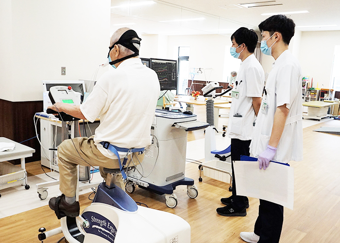 握力や膝関節伸展筋の筋力、片脚立位などのバランス、6分間歩行試験や心肺運動負荷試験(CPX)などの体力を総合的に評価しリハビリテーションを実施しています。基本的には体力をつける有酸素運動、筋力をつける筋力強化運動の2つを中心に、また運動前後に準備体操・整理体操も併せて実施していきます。また必要な方には自宅での家事動作等も評価・練習していきます。リハビリテーション中は心疾患のリスク管理として心電図や血圧などの確認を適宜行います。