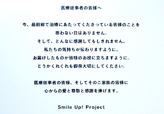 ジャニーズグループSmile Up!Project様から、貴重な防護服と医療用マスクを大量に寄贈いただきました。大切に活用させていただきながら、患者様のため引き続きスタッフ一丸となって尽力してまいります。どうもありがとうございました。