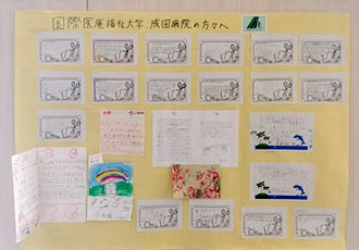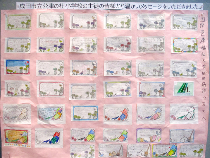 当院のスタッフあてに公津の杜小学校の生徒の皆様から、たくさんの応援のメッセージが届きました。 これは生徒の皆様による発案だということです。 院内に掲示し、職員一同、毎日励みにさせていただいております。 今後も皆様の応援を胸に、地域医療に貢献できるよう尽力してまいります。 どうもありがとうございました。