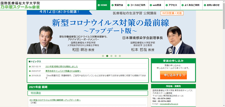 2004年度より公開講座「乃木坂スクール」を開講している国際医療福祉大学大学院では、4月から2021年度前期コースが順次スタートします。昨年度から始まった特別講座「新型コロナウイルス対策の最前線」がアップデートされ、当院の松本哲哉教授と和田耕治教授をコーディネーターとして、COVID-19の対策や治療の最前線で尽力している国際医療福祉大学所属の専門家によるリレー講義です。