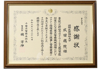 10月12日、千葉県警察本部の新型コロナワクチン職域接種に対して当院が医師を派遣したことに対し、千葉県警から感謝状を贈呈いただきました。