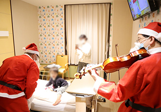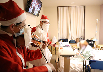 腎泌尿器外科の久末伸一教授と井上高光教授がサンタクロースに扮して、病棟でクリスマスのバイオリン演奏とプレゼントを配布、入院患者さんたちに喜んでいただきました。