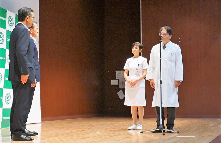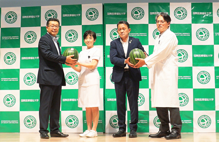 吉野病院長からは「今年もありがとうございます。富里といえばスイカ、スイカといえば富里なので、今日はとても楽しみにしていました。スタッフ皆でいただき、明日からの診療・教育に一層励んでいきたい。当院の患者さんは成田市に次いで富里市の方が多いので、今後さらに医療と福祉を充実させて、富里市との連携・協力関係が進むことを願っています」と感謝をお伝えしました。